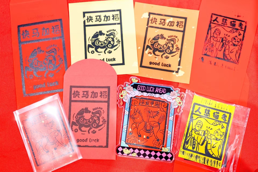 比如,观缘文创的“平安甲马”拓印备受青睐,改良后的云南非遗木刻版画适配各年龄段,成为热门新春信物。同时,梅陇花影社皮影、罗阳八居“福马”剪纸、侨之家沈志华老师亲授的生肖马面塑轮番圈粉,糖画、马主题钩针、盘扣尽显匠心。另外,富华优配汉服社的汉唐华服展示与礼仪教学氛围感拉满,搭配猜灯谜、投壶等民俗项目,老少同乐,重拾传统年味。