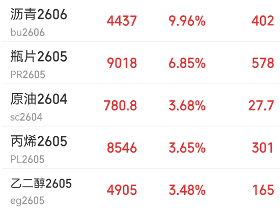 受原油、PTA、乙二醇价钱上升及现货畅通病笃等影响,瓶片期货主力2605合约涨近7%,价钱重点显赫上移。