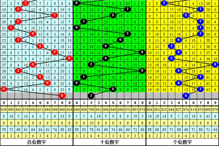 百位分析:该位最近10期开出了3个0路号码、3个1路号码、4个2路号码,2路号码热出。本期扬弃1路号码,参考号码:8。