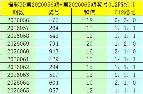 上期总结:福彩3D第2026065期开出奖号:057。奖号为组六格式,与试机号有同号,奇偶比为2:1,大小比为2:1,012路比为1:1:1,和值为12,富华优配跨度为7。