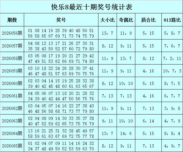 福彩称心8第2026065期开奖总结:01 02 04 07 09 11 14 16 24 32 34 37 48 49 50 52 53 59 63 70,其中奖号大小比开出8:12,奇偶比开出9:11,质合比开出7:13,012路比开出4:9:7。