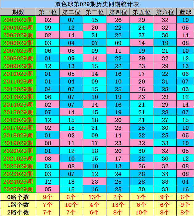 第六位:历史同时0路红球开出:21、27、30、33;1路红球开出;19、22、25、28、31;2路红球开出;29、32,红球012路个数比为9:6:8,现时2路红球历史同时轮空3年,本年同时刺目2路红球出现,参考号码32。