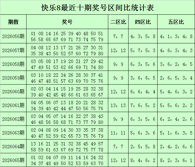 福彩兴隆8第2026065期开奖回想:01 02 04 07 09 11 14 16 24 32 34 37 48 49 50 52 53 59 63 70,其中奖号二区比为8:12,四区比为8:4:6:2,五区比为8:2:3:6:1,除2尾数比为9:11,除4尾数比为6:5:5:4,除5尾数比为2:3:5:3:7。