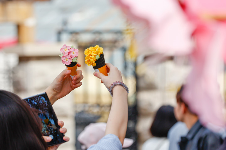 在天津市五正途表象区,搭客手举海棠花造型雪糕拍照留影。新华社发(杜鹏辉 摄)