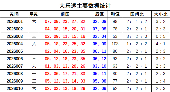 回顾:大乐透上期奖号为:前区02 03 13 18 26,后区02 09,前区奖号和值为62,区间比2:2:1,大小比为2:3,