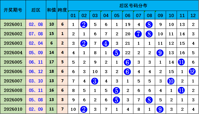 后区综合分析:上期开出后区号码:02 09,跨度7,较前一期相比跨度上升4个点位。本期预测跨度值下降,推荐号码:05 11,跨度6。