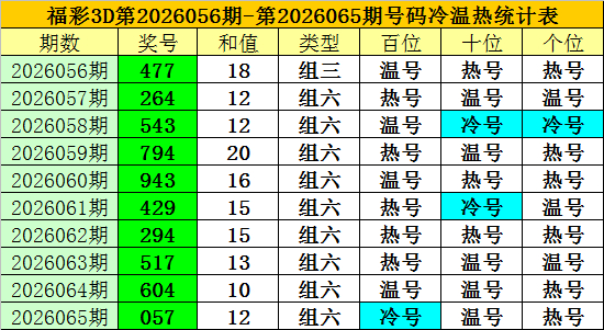 上期归来:福彩3D第2026065期开奖奖号为:057,奖号类型为:组六,奖号冷温热态为:冷号+温号+热号。