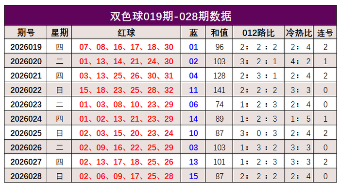双色球第2026028期开奖奖号:红球02、06、09、17、25、28,蓝球15。红球和值87,012路比2:2:2,冷热比2:4,未开出连号。