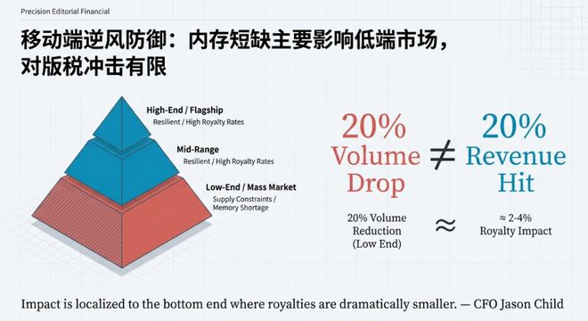 他同期强调,低端产物对应的版税水平更低,因此冲击可控,并给出压力测试: