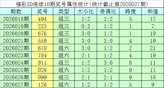 开奖回顾:福彩3D第2026027期奖号为126。奖号形态为组六,大小形态为小小大,奇偶形态为奇偶偶,和值为9,跨度为5。
