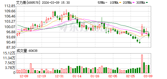 艾力斯3月9日大批交游平台出现一笔成交,成交量10.00万股,成交金额940.30万元,大批交游成交价为94.03元。该笔交游的买方生意部为机构专用,卖方生意部为摩根大通证券(中国)有限公司上海银城中路证券生意部。